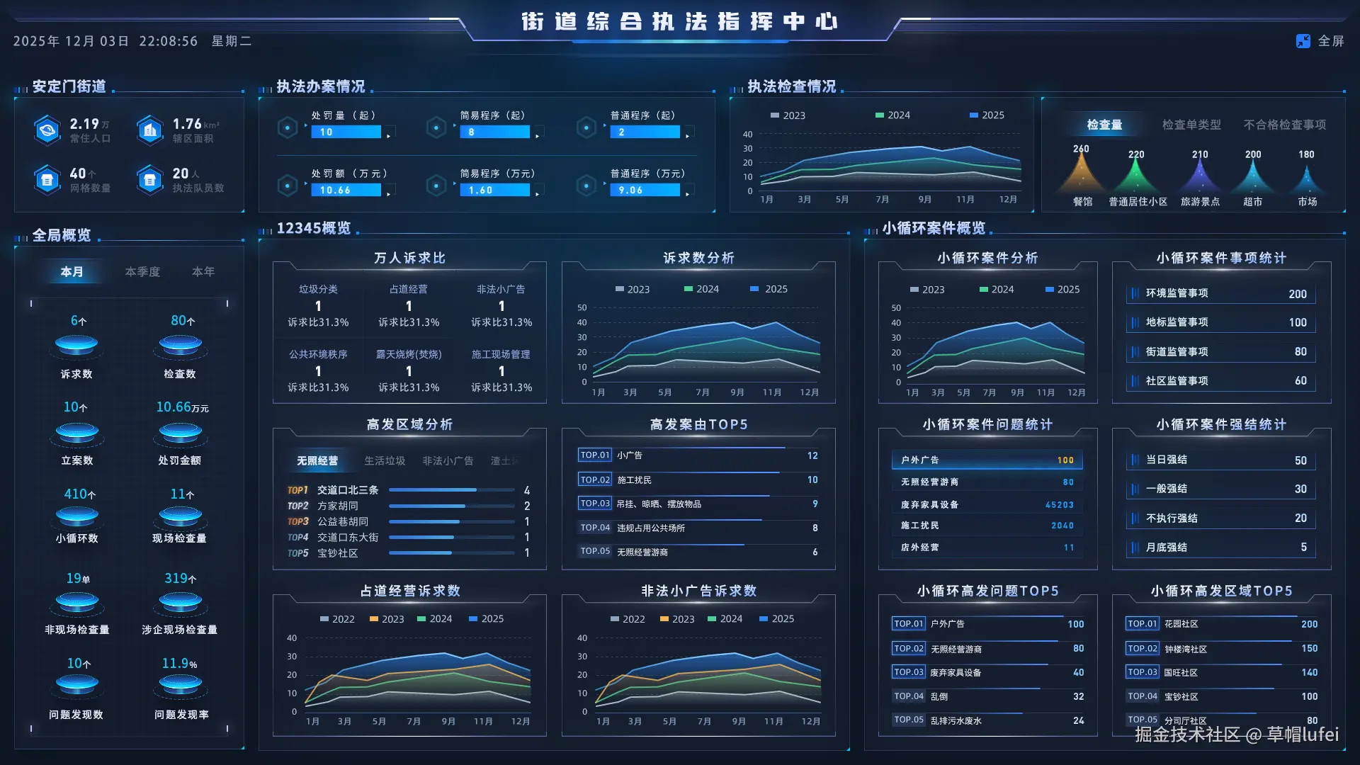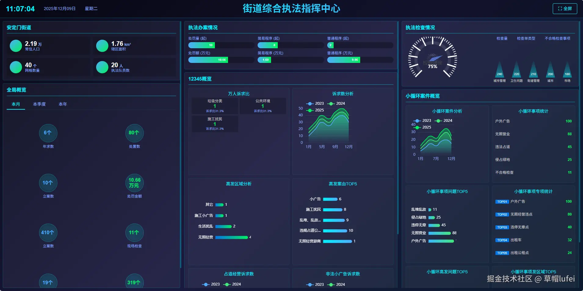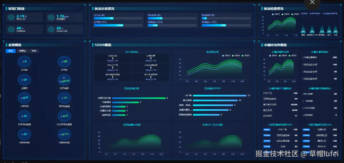 将左侧 安定门街道 和 全局概览 卡片宽度减小一点,让右侧的 执法检查情况 和 小循环案件概览 空间更大一点