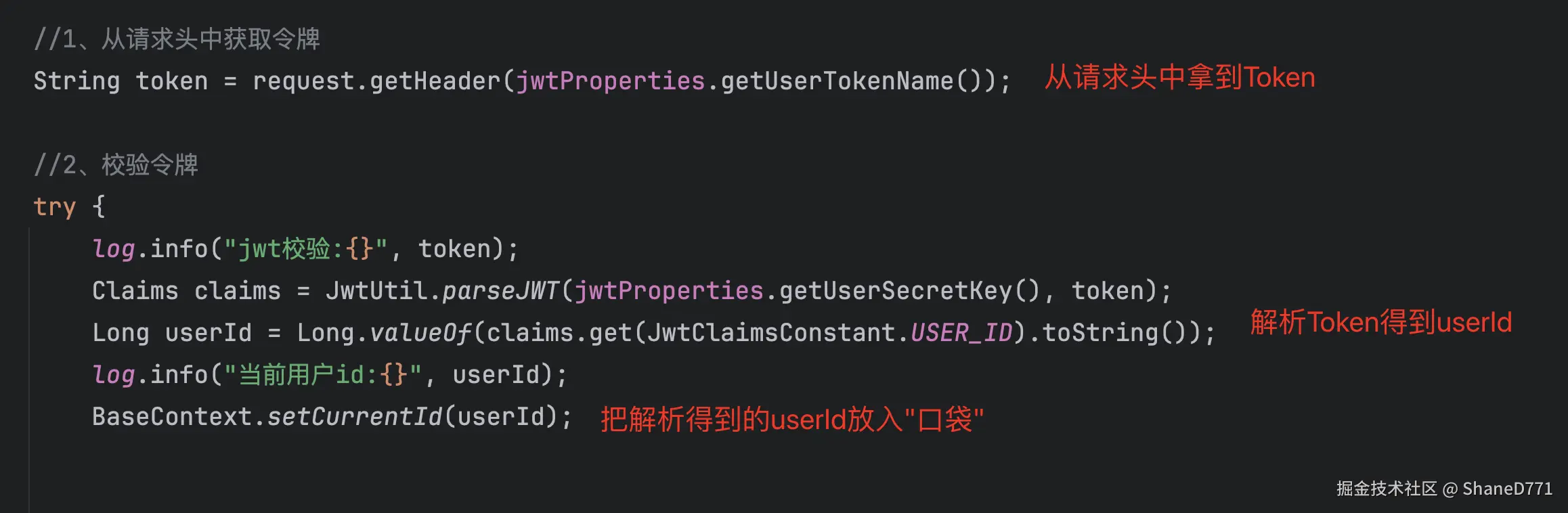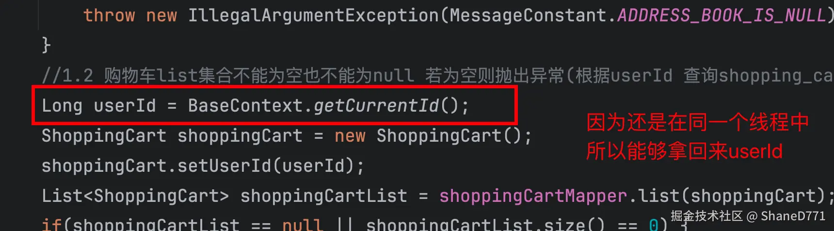 使用 ThreadLocal (BaseContext) 的方案,实现了数据在同一线程内的"隐式传递",让代码极其简洁优雅。