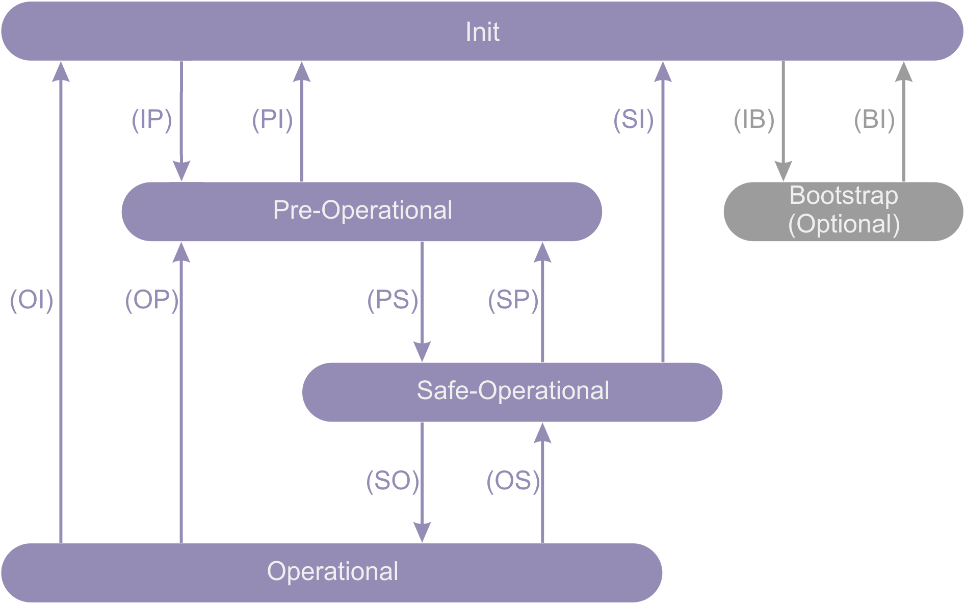 | 引导加载状态(Bootstrap) | 仅可从初始化状态进入,且仅能切换回初始化状态;适用于固件更新场景,应用层支持邮箱通信,但仅启用 EtherCAT 文件访问协议(File-Access-Over-EtherCAT),无过程数据通信 |