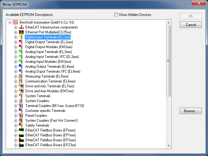 - 浏览...(Browse...)按钮:打开对话框以搜索并打开 EEPROM 描述文件(文件类型为 "EtherCAT 端子配置文件(*.bin)")。