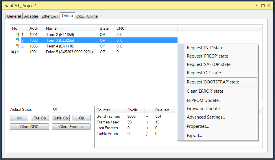 在 EtherCAT 从站设备列表视图中右键单击,将打开上下文菜单。若未选中任何设备,"请求'INIT'状态""请求'PREOP'状态""请求'SAFEOP'状态""请求'OP'状态""请求'BOOTSTRAP'状态""EEPROM 更新..." 和 "高级设置..." 选项将呈灰色不可用状态。