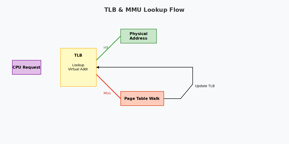 - TLB查找:MMU首先在TLB(Translation Lookaside Buffer)中查找该VA对应的物理地址(Physical Address, PA)。