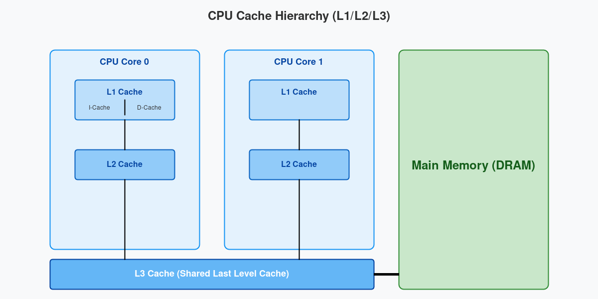 现代CPU为了弥补处理器速度与内存速度之间的巨大鸿沟(Memory Wall),引入了多级缓存体系。