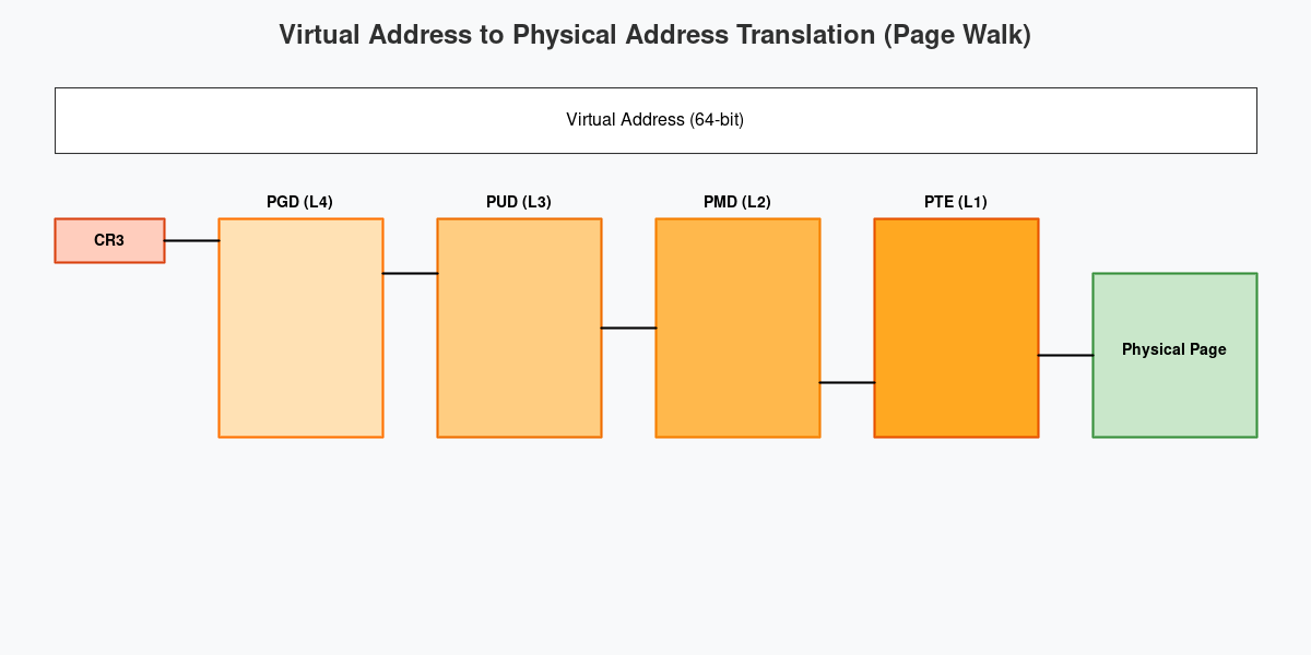 当TLB未命中时,MMU硬件会自动遍历内存中的多级页表。Linux通常采用4级页表(在x86_64架构下):