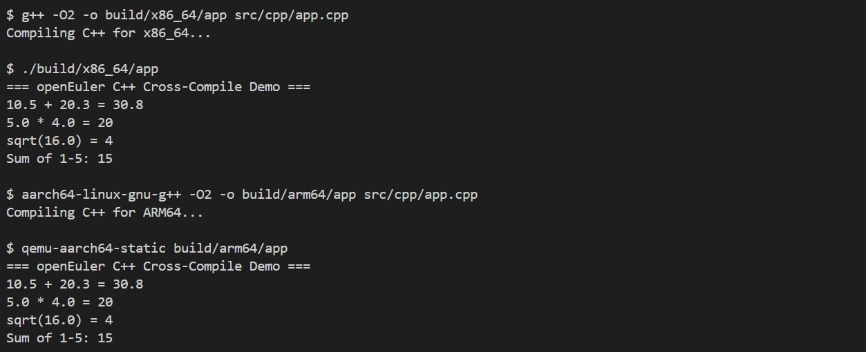 cout << "=== openEuler C++ Cross-Compile Demo ===" << endl;