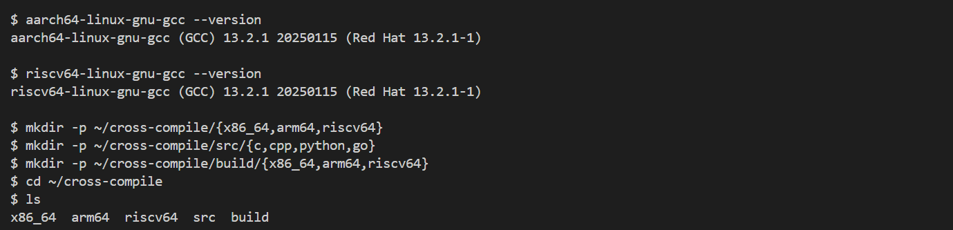 mkdir -p ~/cross-compile/build/{x86_64,arm64,riscv64}