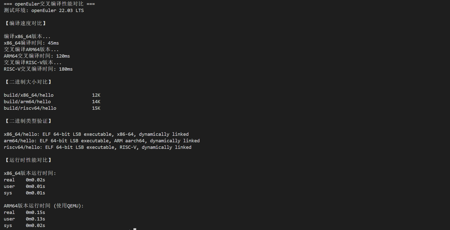 | C编译时间 | 45ms | 52ms | 58ms | 交叉编译略慢 |