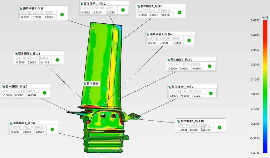 新拓三维XTOM-STATION自动化检测中心,可实现叶片自动三维测量,基于测量结果可对叶片的弦长、叶厚、叶缘R参数等进行自动分析,判定叶片是否合格。