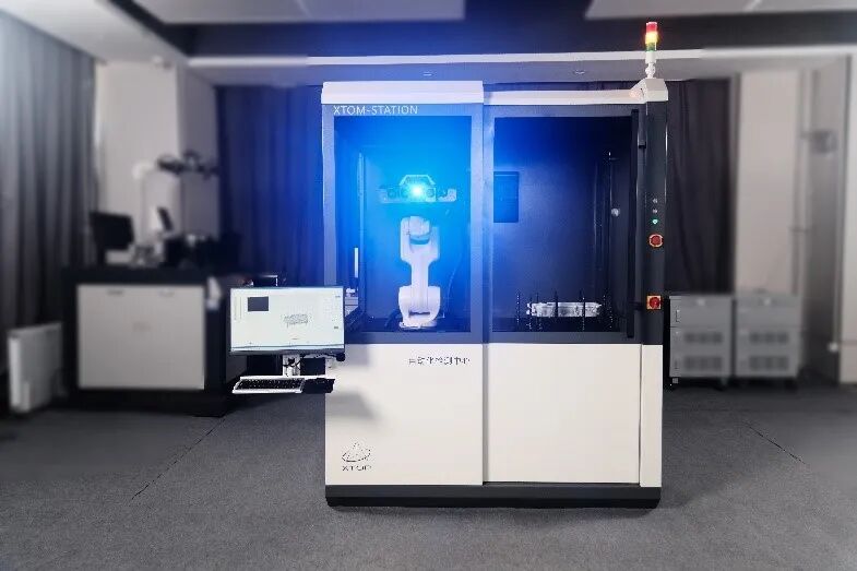 新拓三维XTOM-STATION自动化检测中心,采用工业机器人+固定式蓝光三维扫描自动化3D测量解决方案,高效集成了工业机器人和蓝光3D扫描技术 的各自优势,可高精度高细节还原度获取工件表面的三维数据,通过与理论数模进行对比,分析出检测工件特定尺寸或缺陷,从而完成生产工件批量化、自动化3D检测,为各种测量任务提供了高效、精确和自动化的解决方案。