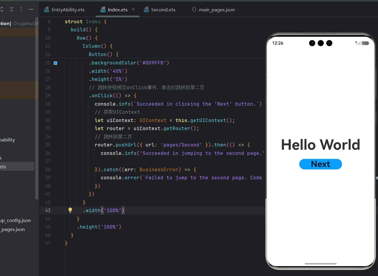 重点来了!给Index页面的「Next」按钮加点击事件,实现跳转到Second页面。我把完整代码放这,关键步骤标了注释,直接复制替换原来的Index.ets就行: