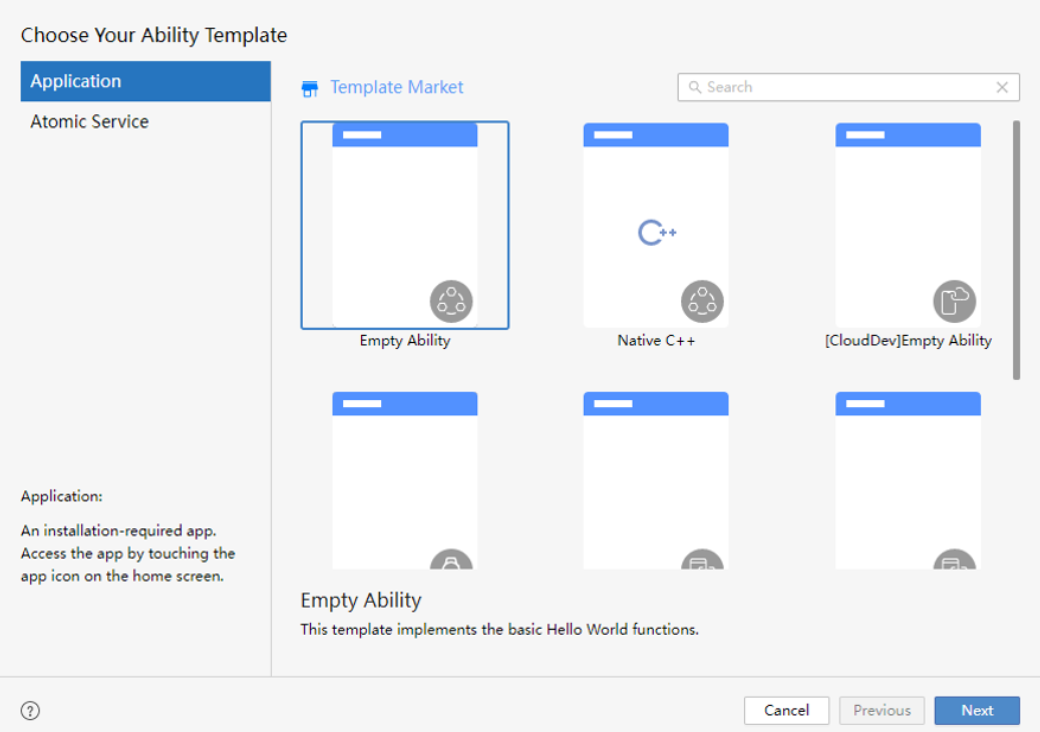 选对工程模板: 左边栏选「Application」(做元服务就选Atomic Service);