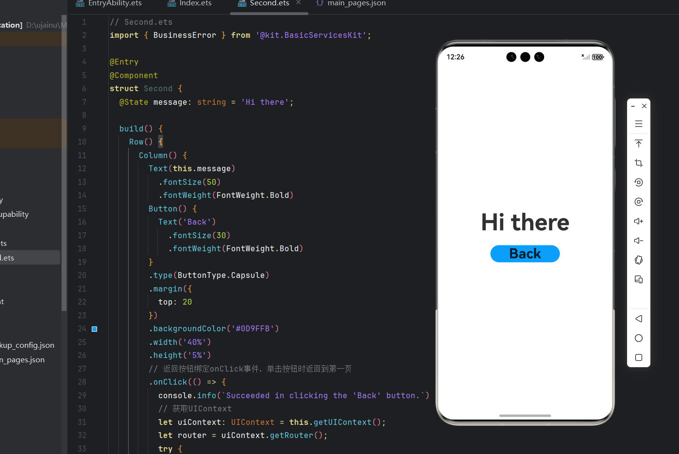 // Second.ets @Entry @Component struct Second { // 状态变量:页面显示的文本,改成Hi there @State message: string = 'Hi there'; build() { // 和首页完全一样的布局结构,不用改 Row() { Column() { Text(this.message) .fontSize(50) .fontWeight(FontWeight.Bold) // 返回按钮:样式和Next按钮一致,只改文字 Button() { Text('Back') .fontSize(30) .fontWeight(FontWeight.Bold) } .type(ButtonType.Capsule) .margin({ top: 20 }) .backgroundColor('#0D9FFB') .width('40%') .height('5%') } .width('100%') } .height('100%') } }五、核心功能:实现页面间跳转与返回