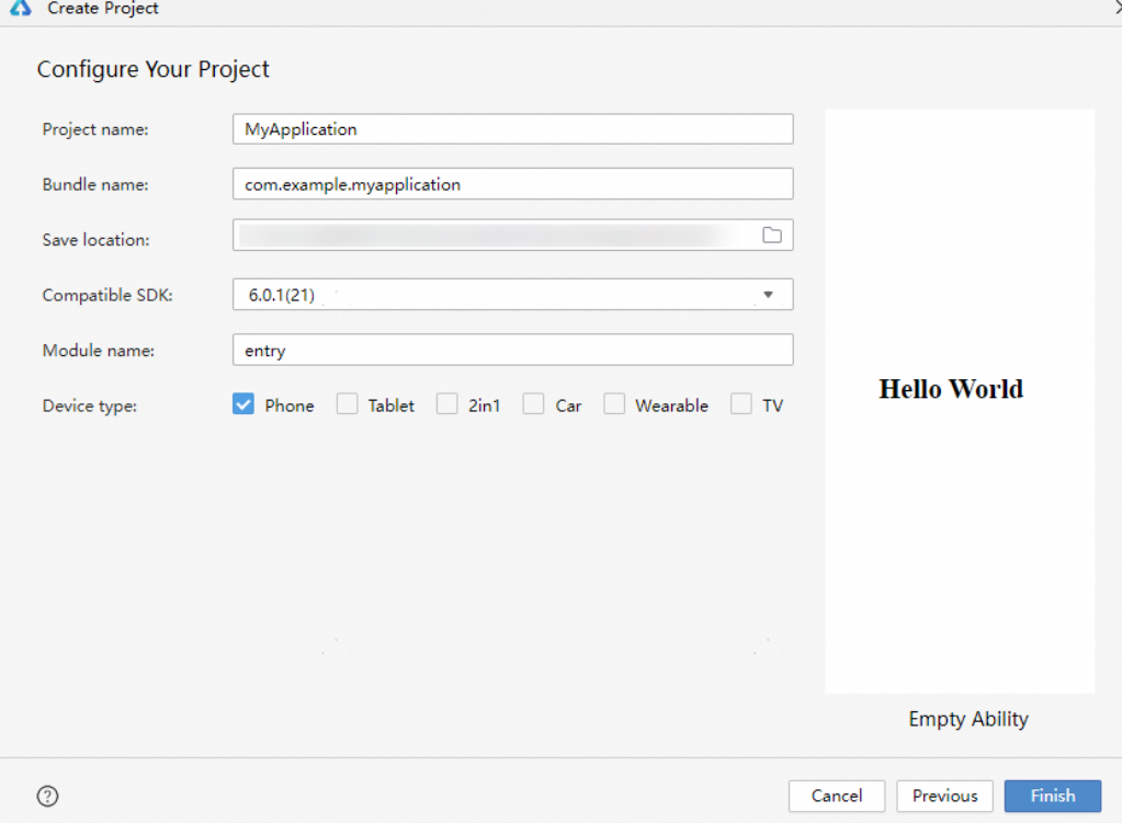 完成创建:点「Finish」后,DevEco会自动生成工程文件和示例代码,等底部进度条走完,同步完成就可以开始写代码了。