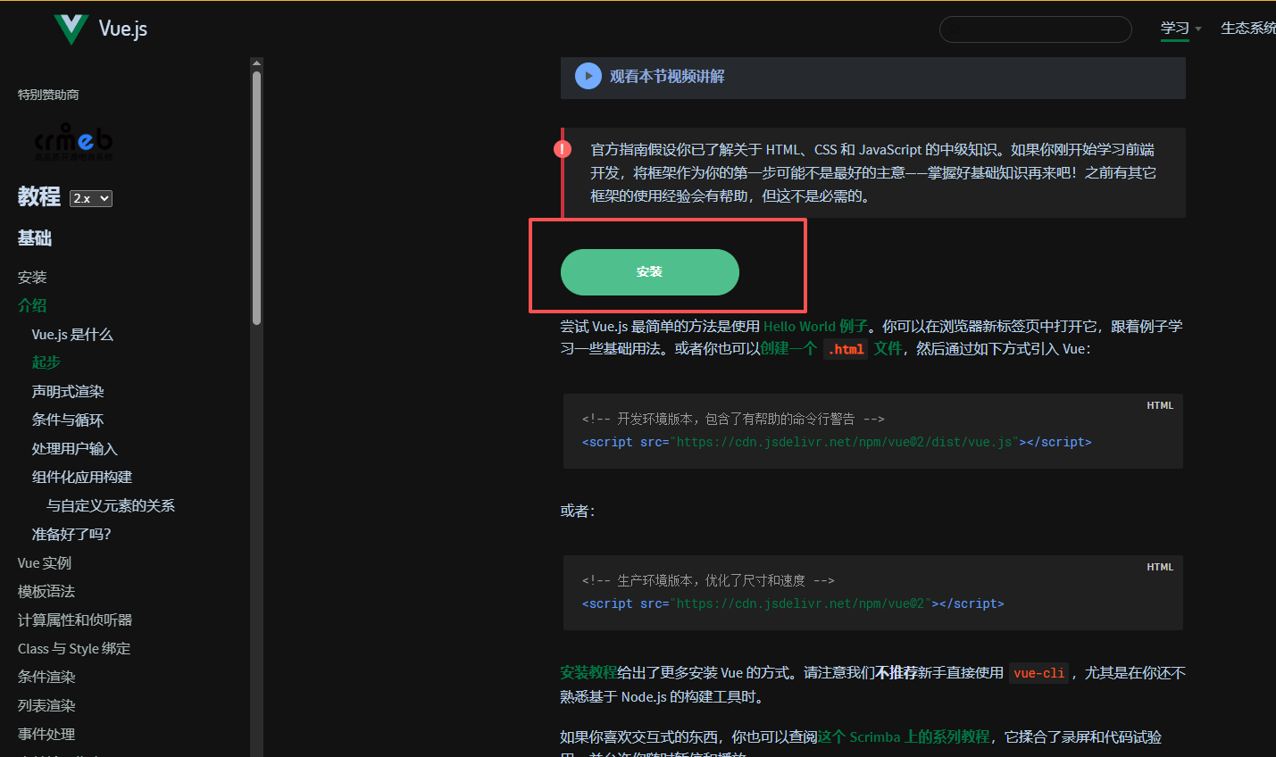 默认就来到了介绍,介绍页面往下拉,就能看到开发环境的安装按钮。