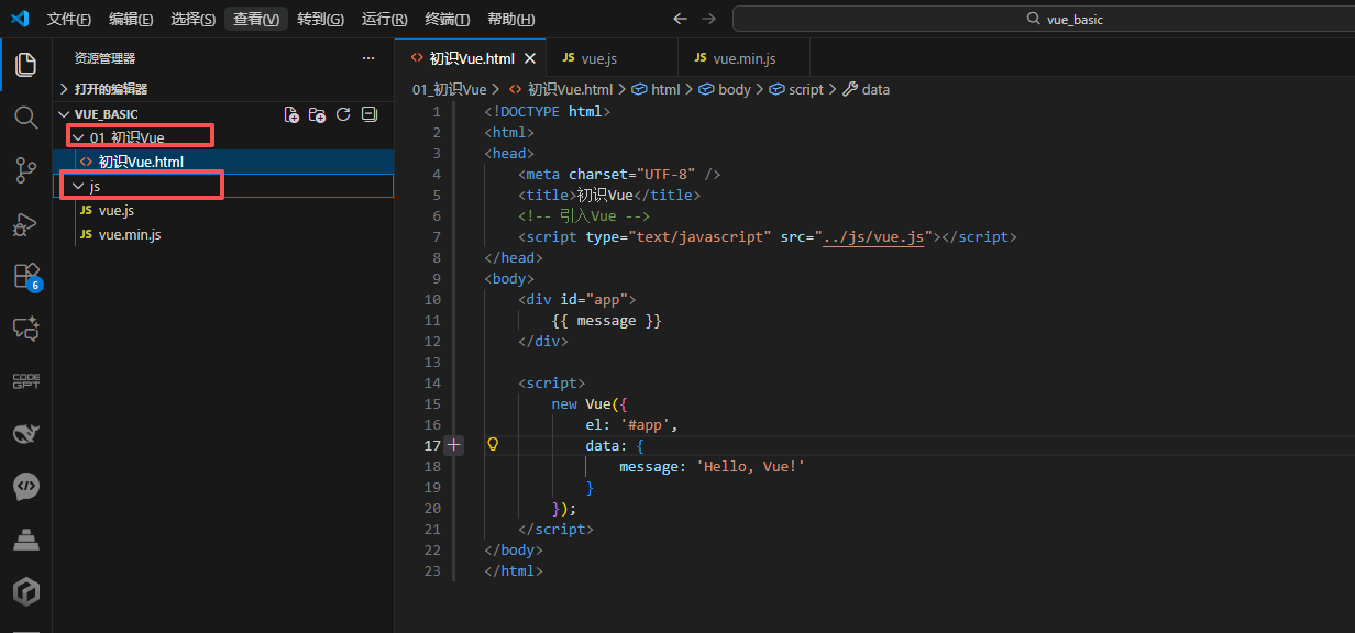 我们看到这里在vue_basic下创建了一个用来放文件的01_初识Vue,里面新建一个html文件。