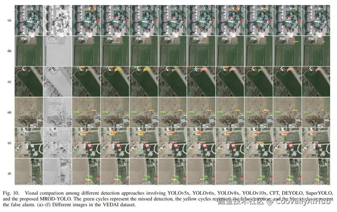 在VEDAI数据集上,MROD-YOLO的mAP50达到77.9%,超过YOLOv10(72.3%)、CFT(73.7%)等先进方法,尤其在小目标检测上优势明显。