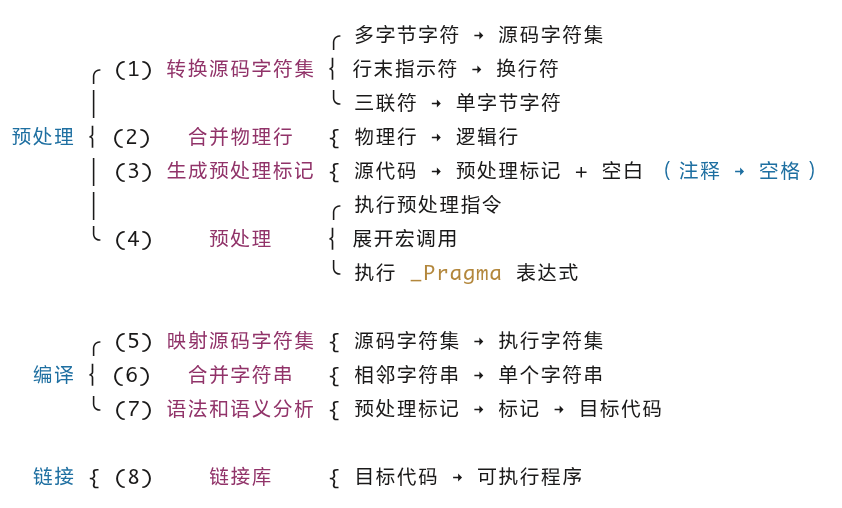 C 语言标准将 C 程序的翻译过程分解为以下 8 个阶段(详细内容可以参考 C23 标准的 5.2.1.2 Translation phases章节或早期标准的相关章节):