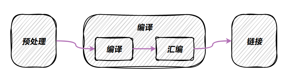 对于上述 8 个阶段,通常步骤 1-4 被称为**"预处理"** ,步骤 5-7 被称为**"编译",步骤 8 被称为"链接"**,其中 ++编译++ 通常会被进一步的处理为 ++编译++ 和 ++汇编++ 2 个子阶段。