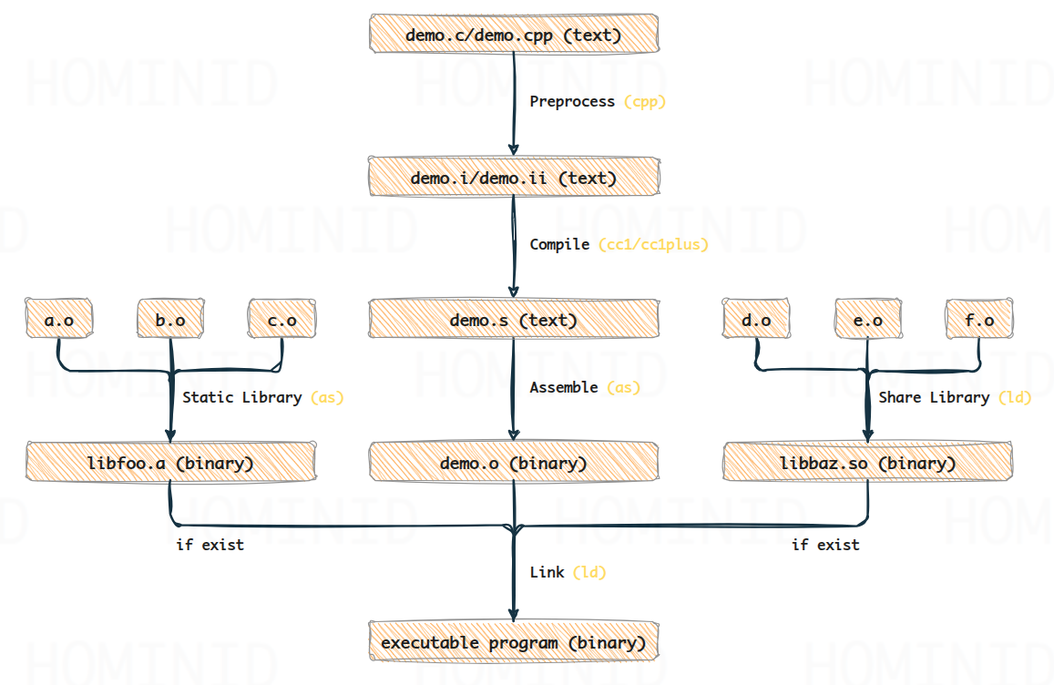 使用 gcc 进行编译时,通常会经历 预处理 、 编译 、 汇编 和 链接 这 4 个阶段。它实际上是通过调用 预处理器 、 编译器 、 汇编器 以及 链接器 来实现这些步骤,所以 gcc 本质上是一个驱动程序(可以通过 gcc -### no-exist-file.c 来查看编译器、汇编器和链接器的子命令);