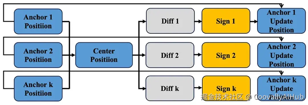 - 计算质心:首先找到所有锚点框的中心点,并计算它们的平均中心(质心)。