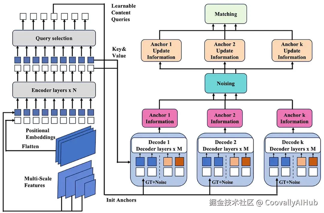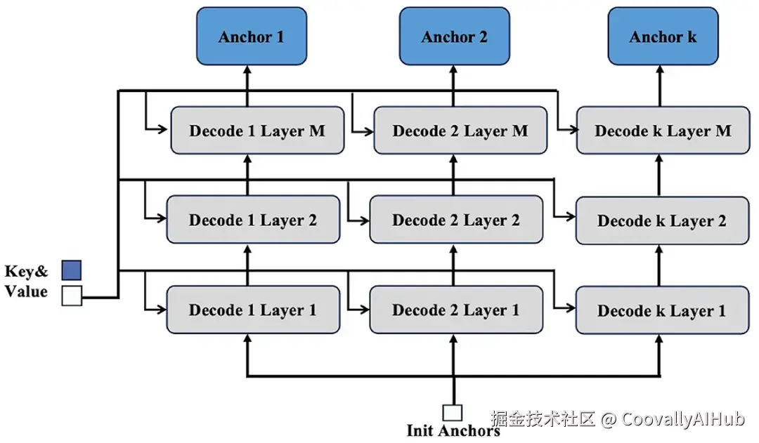 NAN-DETR引入了多个独立的解码器。想象一下,我们不是派一个侦查员,而是派出一支侦查小队(k个解码器)。每个队员都从同一初始线索(编码器输出的查询)出发,但凭借各自的经验和视角,对目标的位置进行独立分析和 refinement,最终报告多个可能的位置(锚框)。
