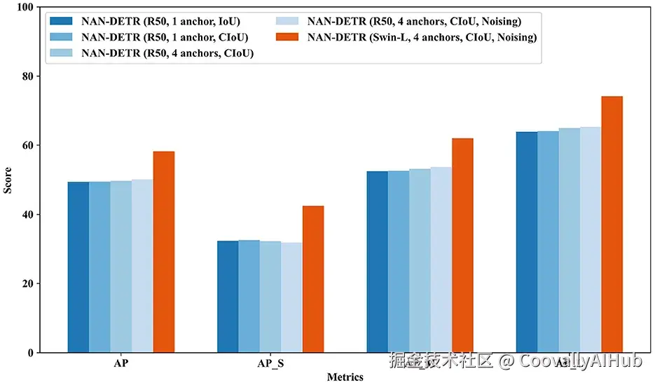 使用更强大的Swin-L骨干网络时,NAN-DETR的AP进一步提升至58.2% 。特别值得一提的是,其在大型目标检测(AP_L)上达到了74.2% ,超越了所有对比方法,这证明了多锚点策略和集中式噪声机制对于大尺度物体检测的独特优势。