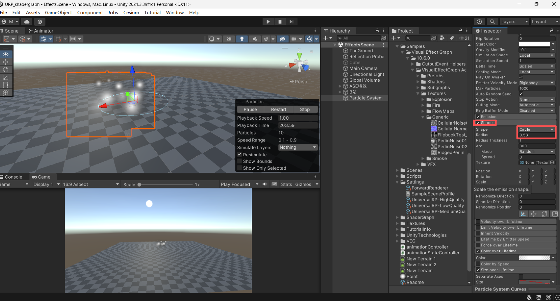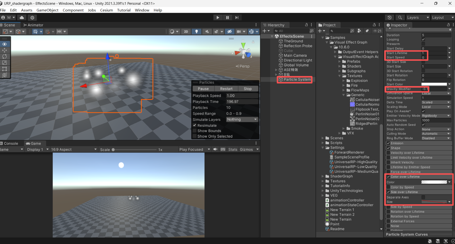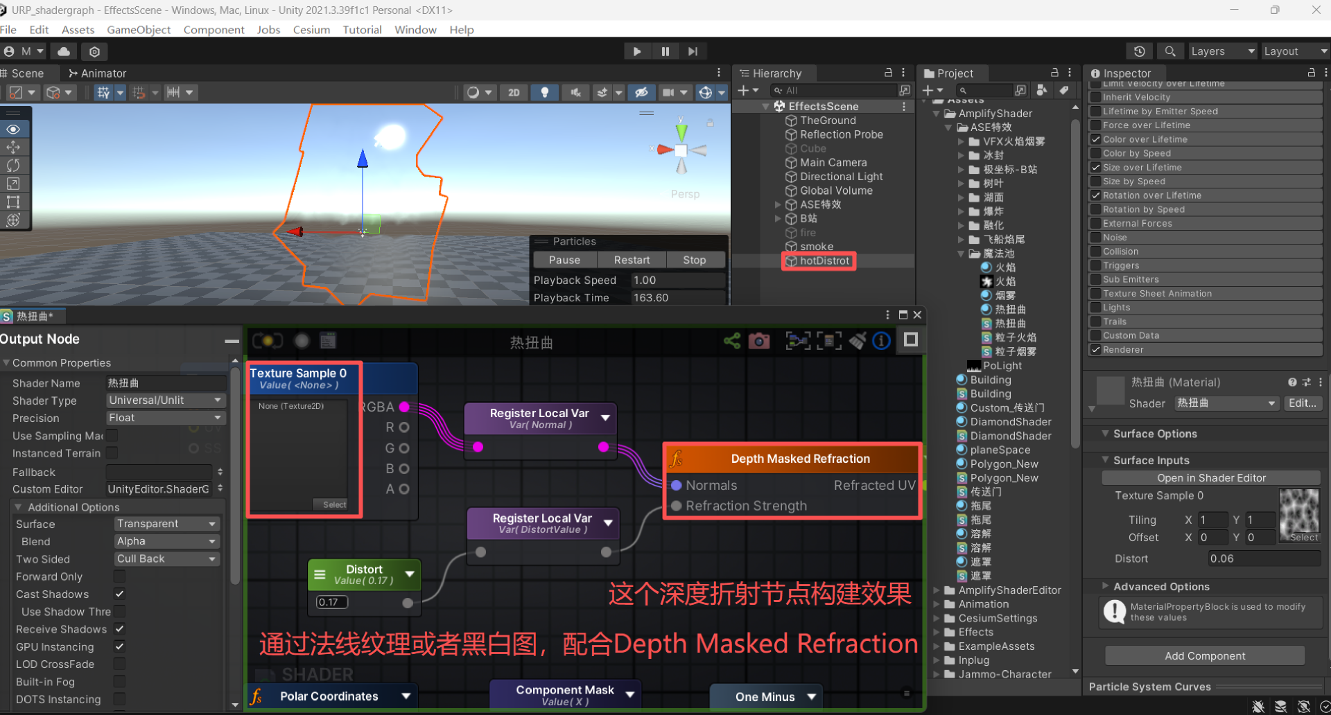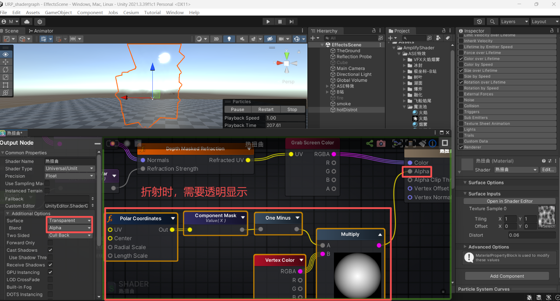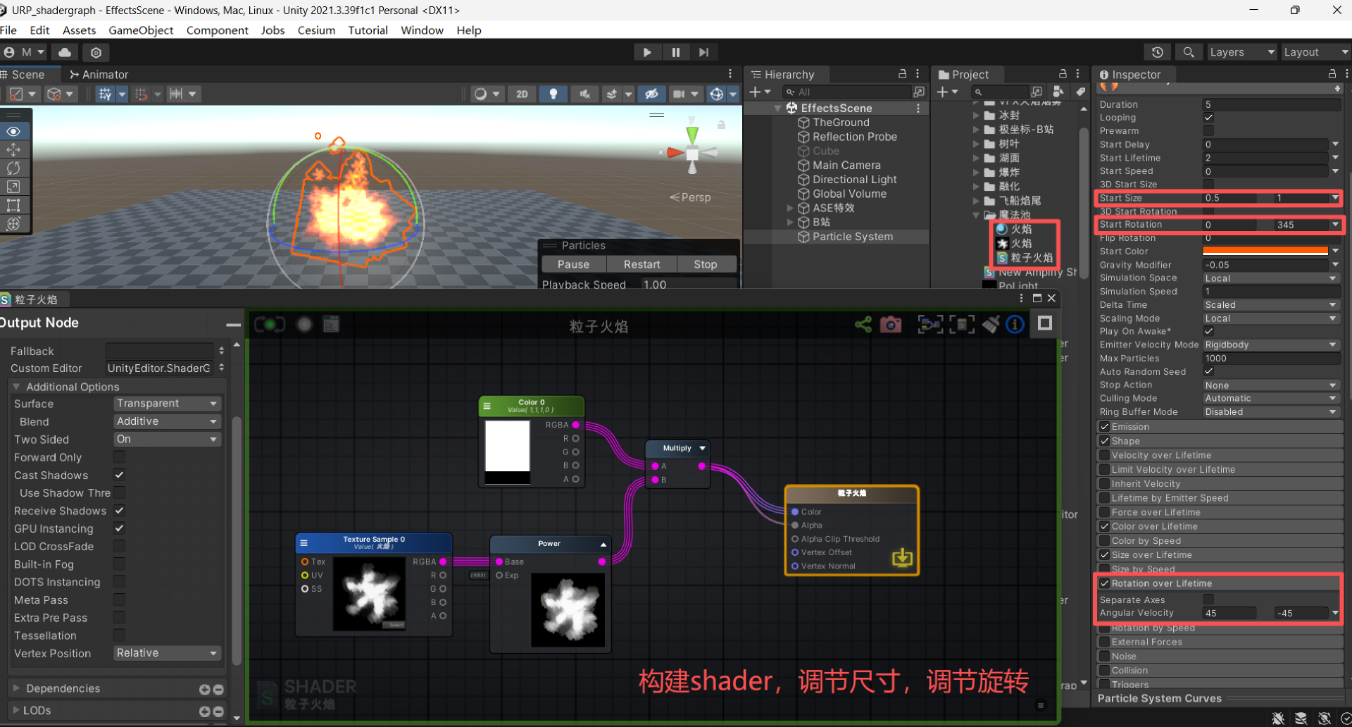 构建ase shader火焰效果,调节大小、调节颜色、重力参数,添加旋转。