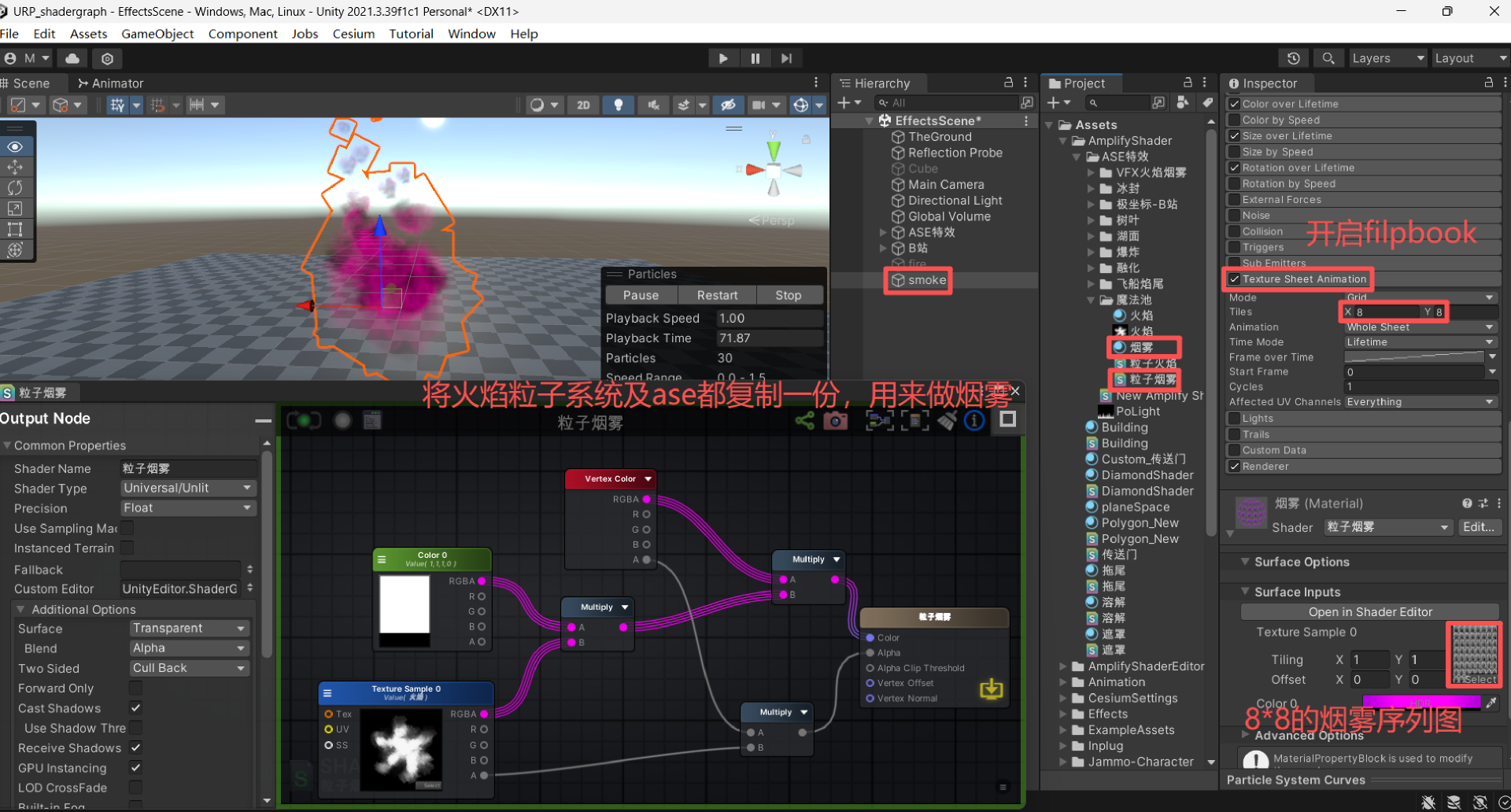 复制火焰的粒子系统和shader材质,用来做烟雾,烟雾使用8*8的序列图即 flipbook。