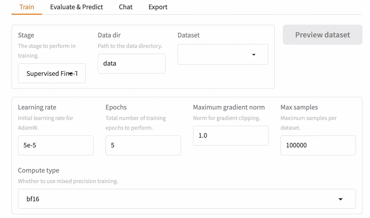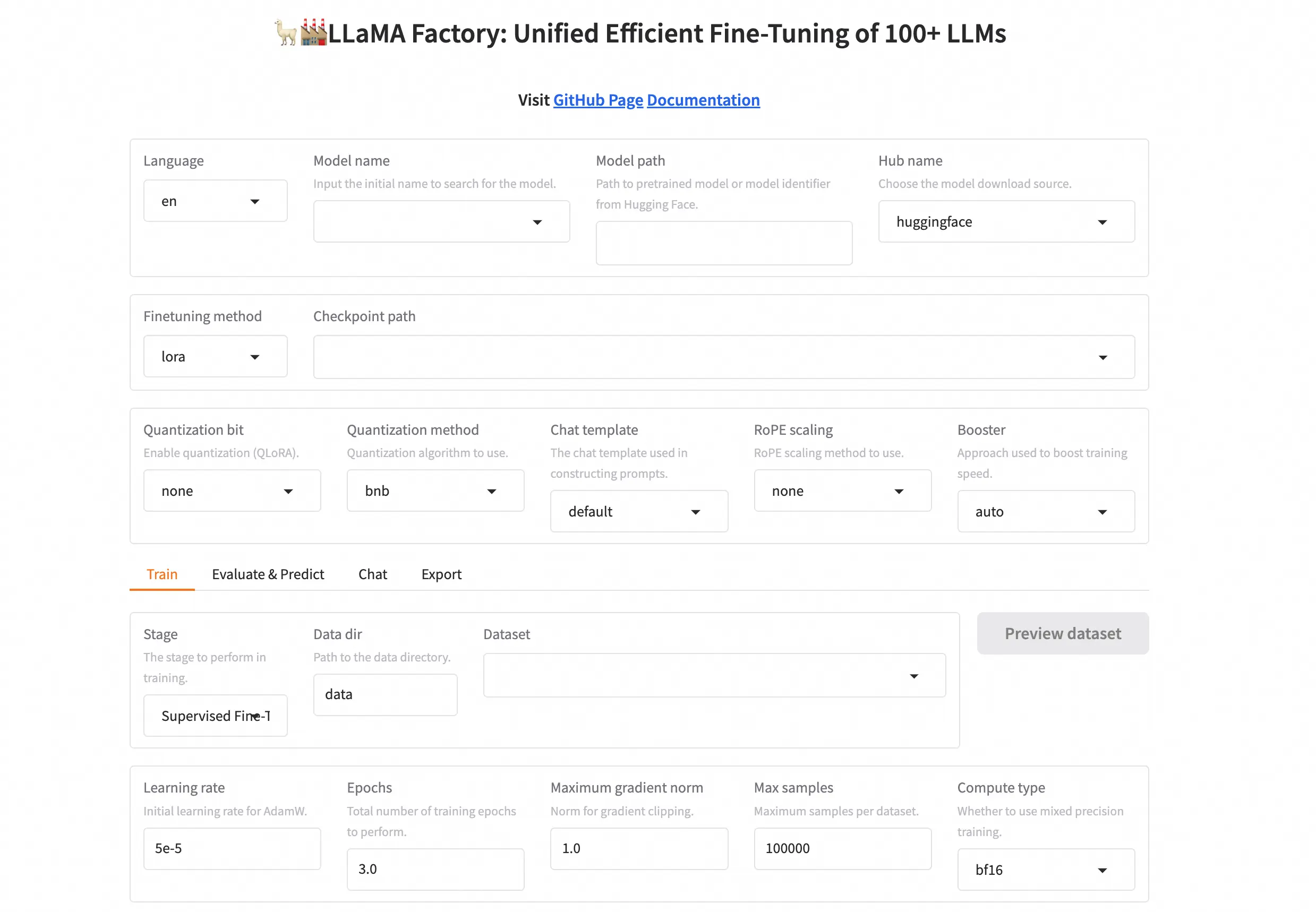 打开 WebUI 界面,你会发现微调大模型并不比使用 Photoshop 复杂多少。我们不需要敲一行 Python 代码,只需在面板上进行"勾选"和"填空"。