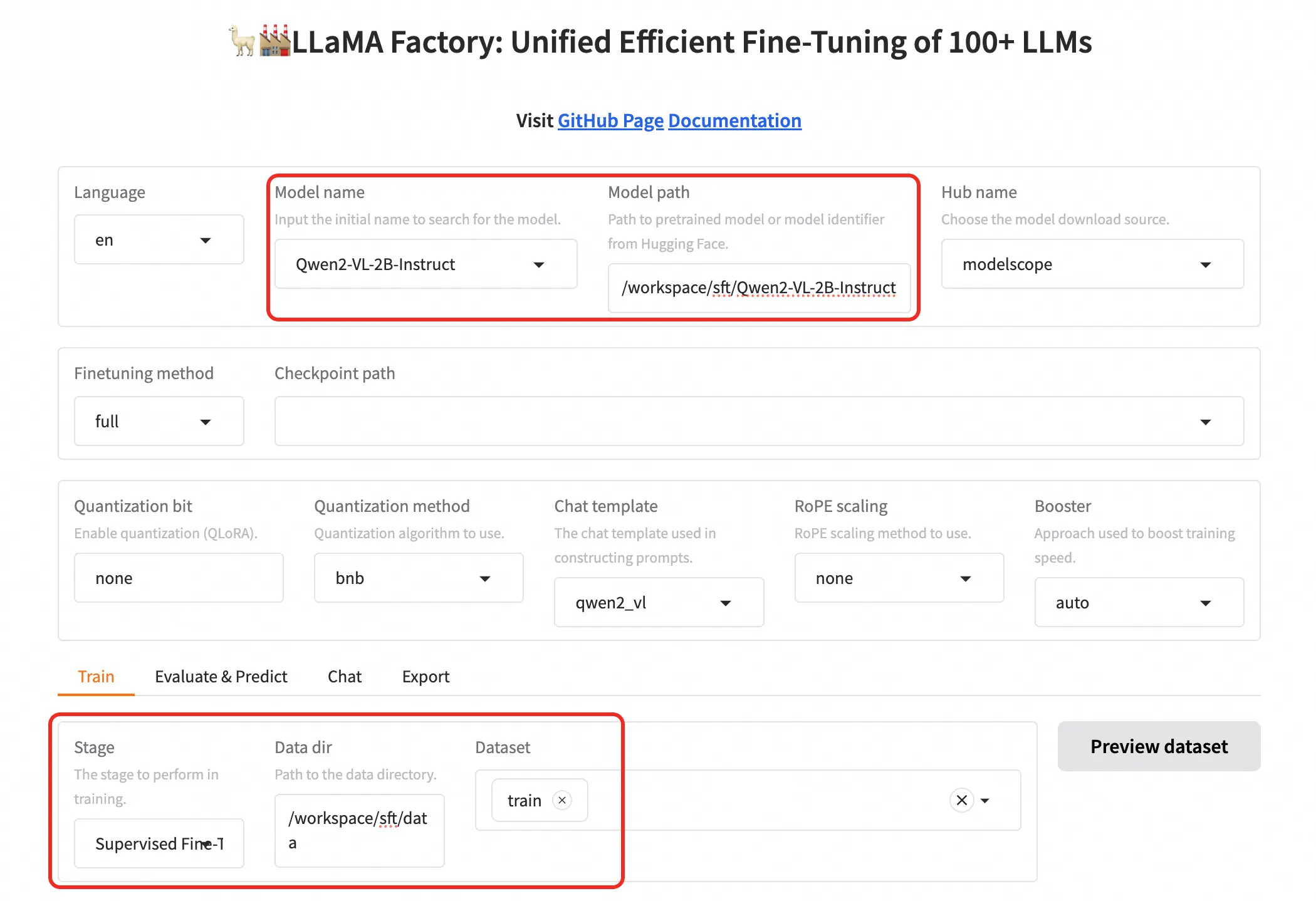 Qwen2-VL(或手动输入模型路径)。 - 数据集 : Llama-Factory 支持标准的 Alpaca 格式或 ShareGPT 格式。对于多模态任务,确保你的 JSON 文件中包含图片路径。