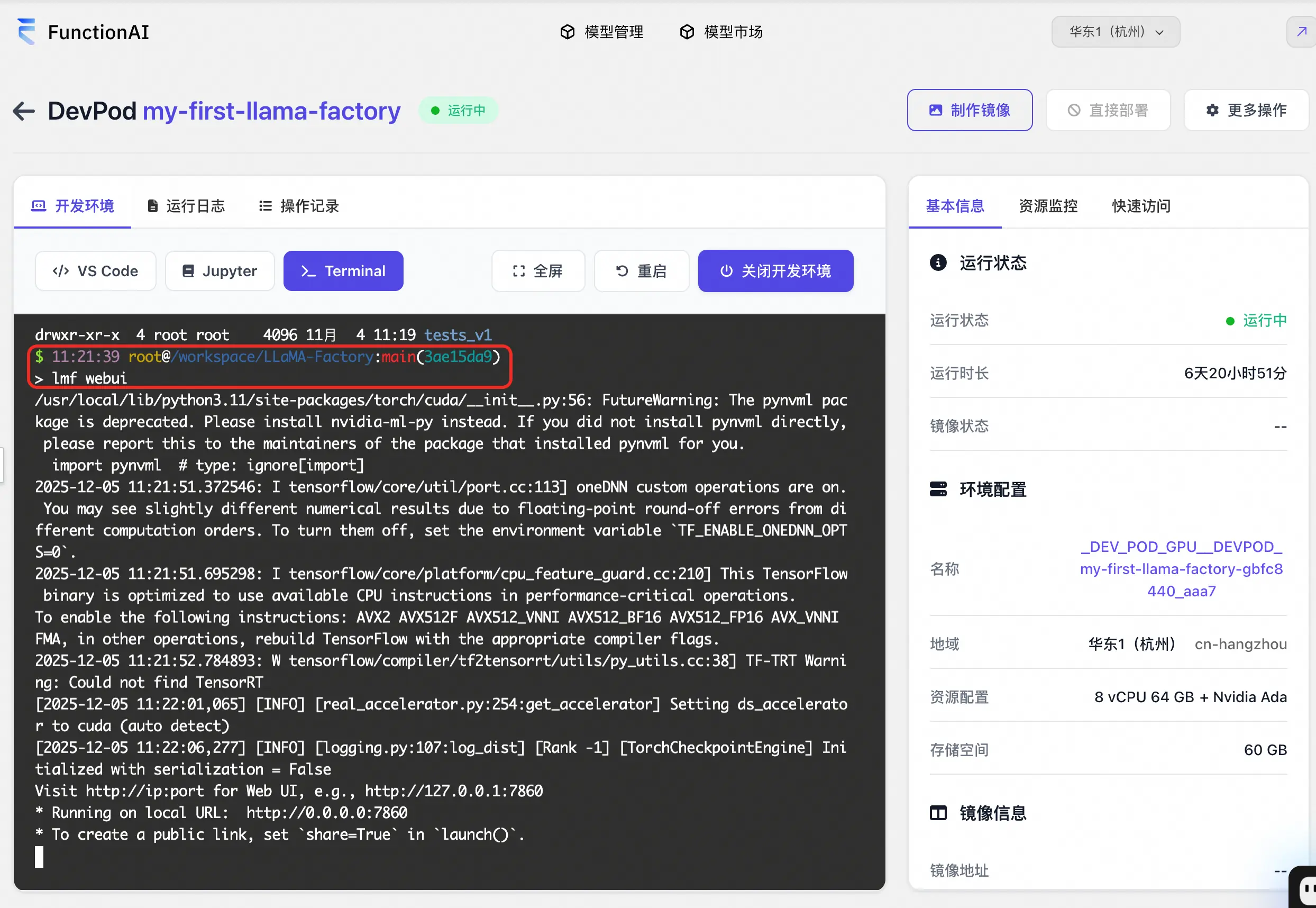 FC 会自动拉取包含 CUDA 环境和 Llama-Factory 框架的镜像。大约等待 1-3 分钟,页面自动跳转到 DevPod 页面,我们进入 Terminal 下,执行命令 USE_MODELSCOPE_HUB=1 lmf webui 启动 llama-factory 的进程。