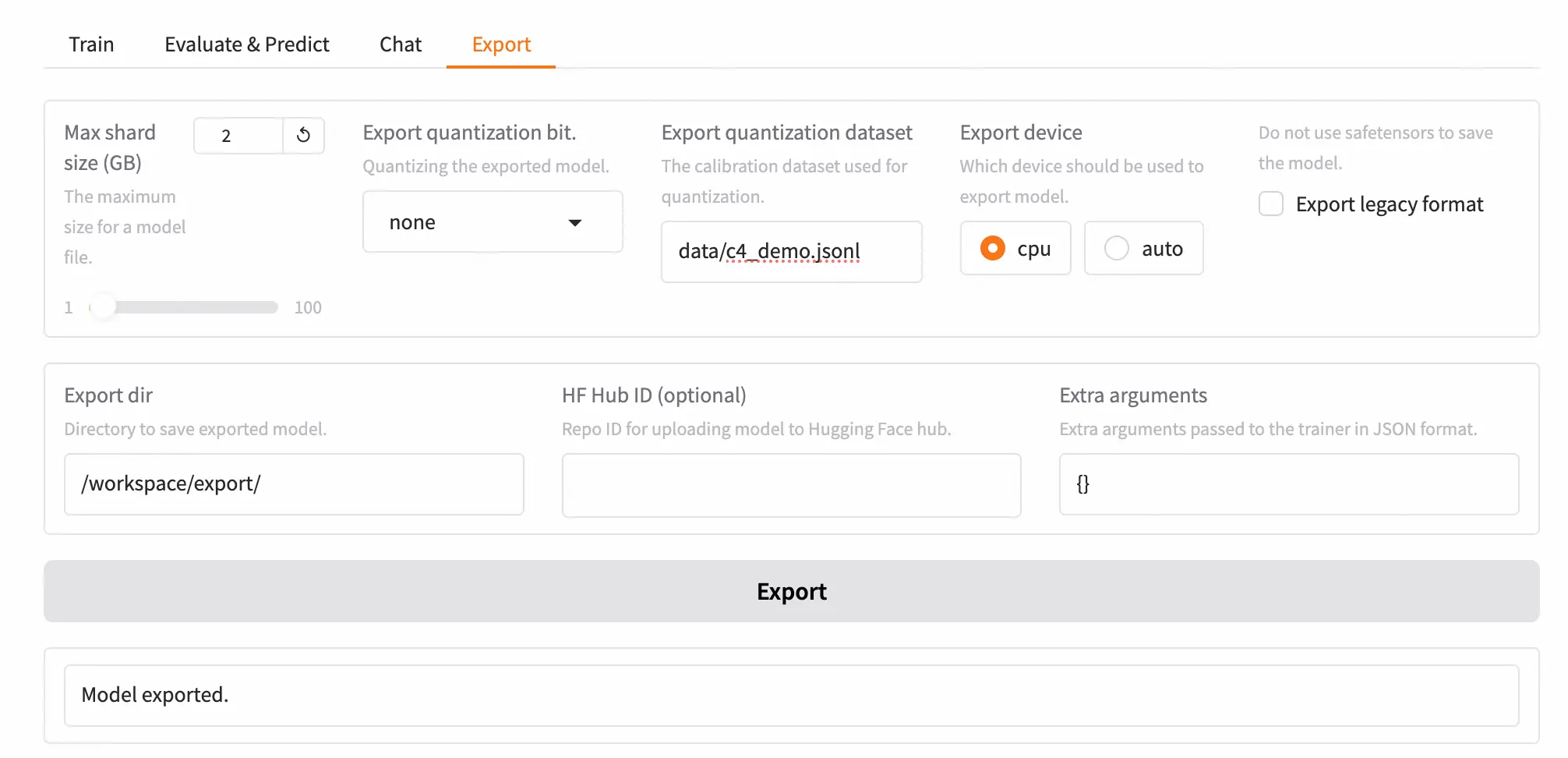Step 3:模型导出与落地 验证满意后,点击 "Export" 页签。