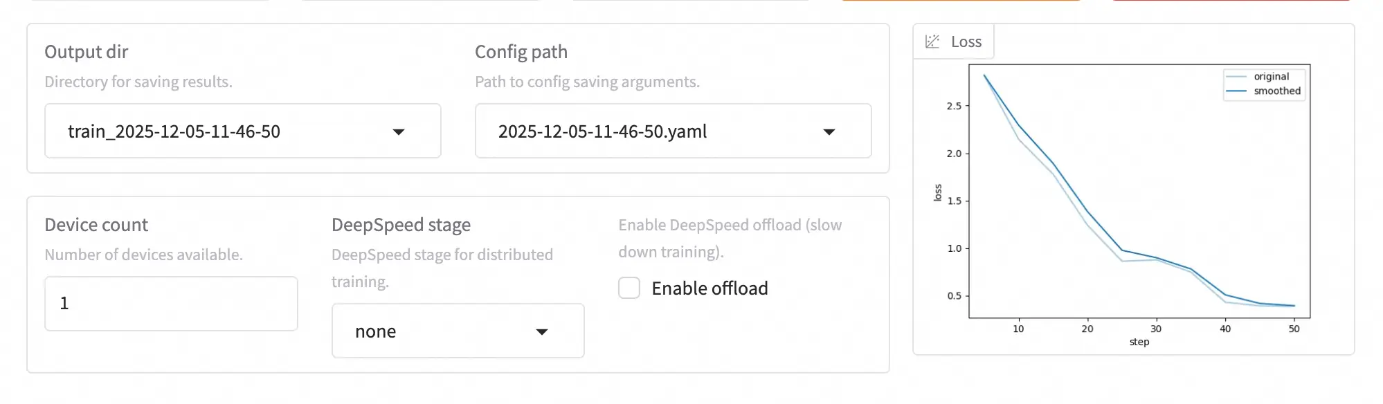 - 零代码门槛: 它提供了一个功能完备的 WebUI 界面。加载模型、配置参数、监控 Loss 曲线、评估效果,所有操作都可以在浏览器中通过点击完成。