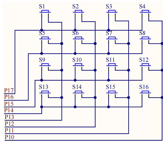 电路中的P17连接矩阵键盘的第1行,P13连接矩阵键盘第1列。