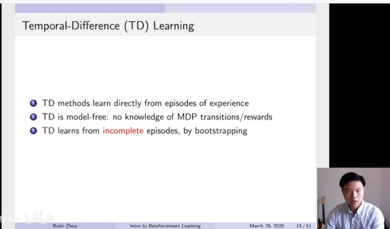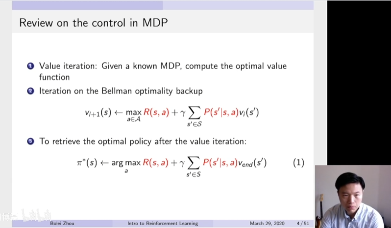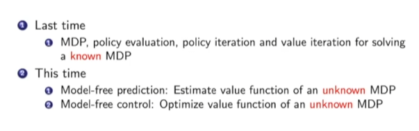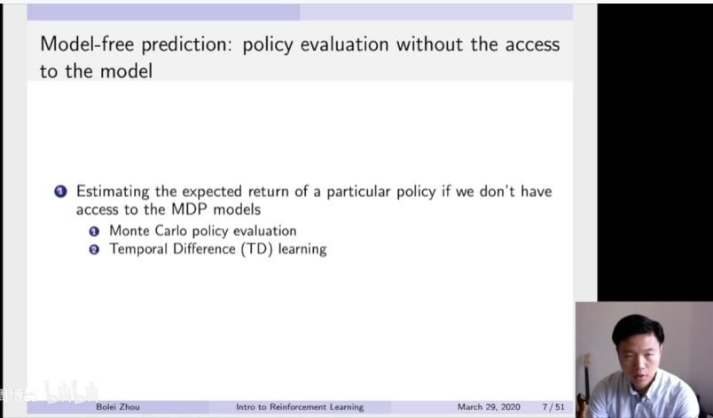 今天是强化学习纲要课程的第三课。我将给大家介绍model free prediction and control。就是在没有模型 的条件下,怎么进行预测跟控制。上一次课我给大家介绍了MDP,然后给定一个policy怎么去衡量一个policy的价值。然后也介绍了两种常见的MDP控制的算法,就policy iteration以及value iteration。