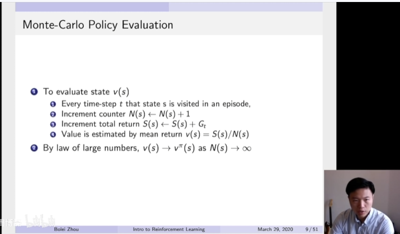 首先是基于蒙特卡罗采样的一个policy evaluation。之前两次课程我也给大家简短的提过,蒙特卡罗方法主要是基于采样的方法,就是让这个agent跟环境进行交互,就会得到很多轨迹,然后每一个轨迹都会得到一个实际的收益。我们实际知道采取的这些行为它到底有没有收益,然后直接从获取的这个实际收益来估计每一个状态的价值。所以这个蒙特卡罗Monte-Carlo policy evaluation也是类似的方法。