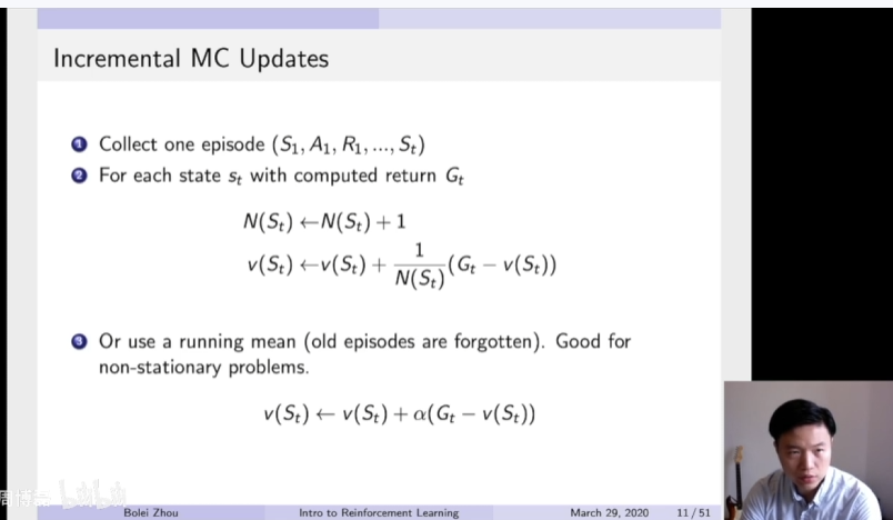 可以把蒙特卡罗更新的这个方法也写成这种incremental MC的一个方法。当我们一直在在跑这个采集数据,然后得到了一个新的轨迹过后,得到了这个新的轨迹。可以在这个轨迹上面的每一个state上面,让它访问的数这个counter加个一,以及它当前对于这个值,也可以用incremental这种增量的办法去更新它的值。这样你可以发现,我们甚至可以把一除以它的这个counting变成一个阿尔法值。这个阿尔法值是learning rate,学习效率,希望它的值跟更新的速率有多快,然后这个值就可以相应的进行设置。所以这里是这个算法,就是增量MC update的一个算法。