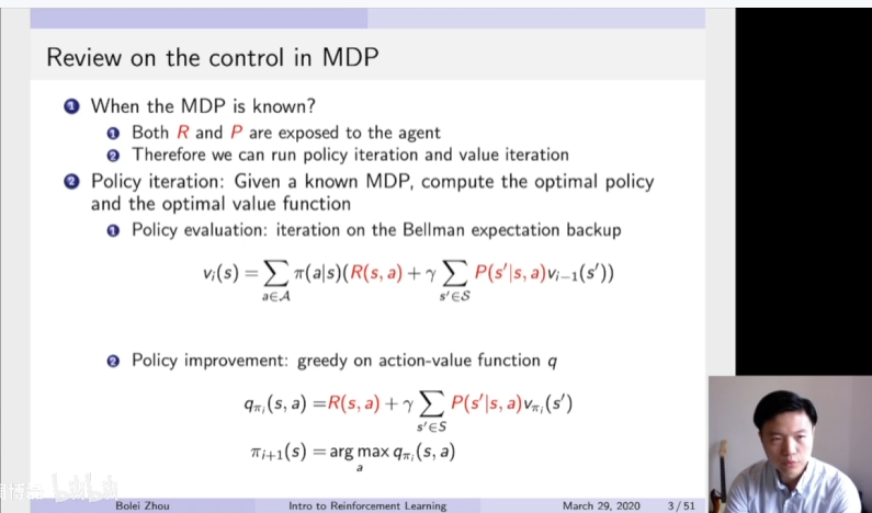 首先来看一下上一次讲的MDP控制算法。我们什么时候说一个MDP已知呢?就是说在MDP马尔科夫决策过程中,它的奖励函数R跟它的转移矩阵P都是暴露给这个agent。所以agent可以通过policy iteration以及value iteration来寻找最佳的策略。这里是policy iteration的算法的一个总结。Policy iteration算法包含了两部分,一部分是policy evaluation,就是给定当前算法,我们利用这个bellman expectation backup来更新我们的价值函数。这样我们就可以通过迭代的办法得到在当前这个策略下面,每一个状态的价值是什么。