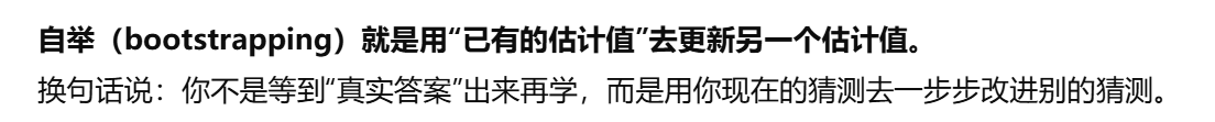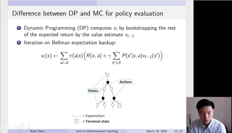 然后我们再来看一下MC跟DP办法的一个差异。dynamic program动态规划这个方法也是一个很常用的来估计某一个价值函数的方法,就给定了某一个策略,来估计它的价值函数。在动态规划里面,是利用了这个Bootstrapping。Bootstrapping翻译成中文是拔靴自助。意思就是要估计一个量,估计这个量是基于之前估计的这个量,就更像we estimate on top of previous estimate,这个是Bootstrapping的一个概念。就要估计一个量,然后通过之前估计的量然后进行得迭代,就希望它最后可以收敛。