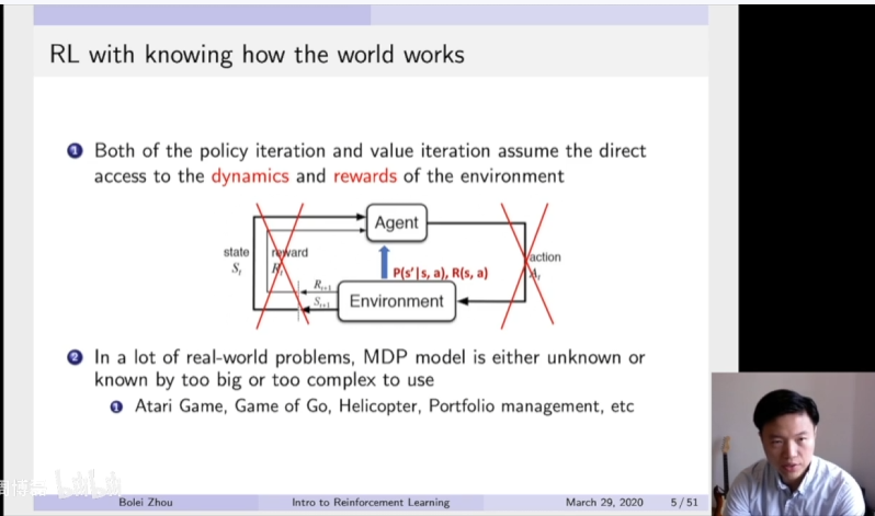 所以看到policy iteration以及value iteration都需要直接得到转移环境的这个dynamics以及它的奖励函数 。所以在这个过程中,其实我们并没有让agent直接跟环境environment进行交互,就并没有用到强化学习的这个diagram。通过这个交互过程然后得到信息。这里更像是在agent找到一个捷径。他直接去通过这个后门获取它的这个转移矩阵以及这个奖励函数来进行迭代的计算到每个状态以及最佳的策略。