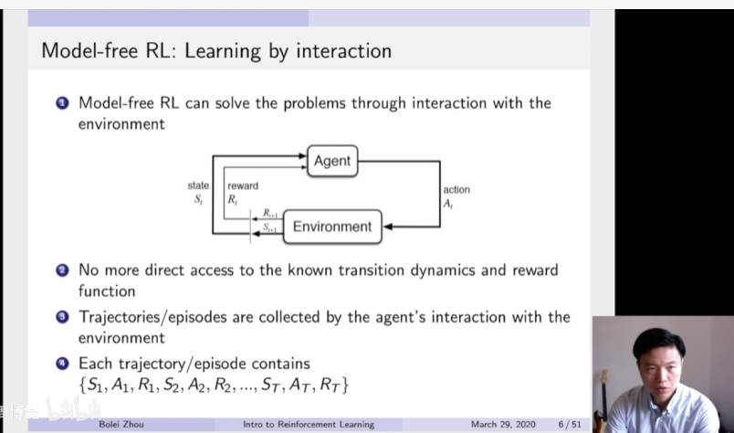 Model free强化学习方法就是利用了这个经典的diagram,就agent通过跟环境进行交互获得这个观测以及获得奖励来调整他的行为。通过一系列的观测收集到的数据来调整它的策略。所以在model free强化学习方法里面,并没有直接获取整个环境的转移状态以及它的奖励函数。是通过让Agent跟环境进行一定的交互,然后采集到了很多的轨迹数据。这里的轨迹数据可以表征成他的起始状态,然后在状态的采取的行为以及他获得的奖励。这样每一步他的一个反馈,得到了这样一个轨迹。那么这个agent就需要从这样的轨迹里面去获取信息,然后改进它的策略,以至于他可以获得更多的奖励。这就是model free prediction and control的一个问题。怎么从通过跟环境的交互获得这些轨迹数据中,然后去估计一个状态的价值,以及进一步改进策略。