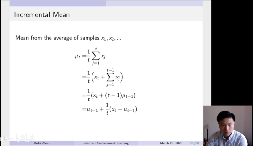 这里可以把empirical mean写成一种这种逐步叠加mean incremental mean的一个办法。比如说现在要估计一个数的平均,那就通过可以采样很多很多次。比如说这个μt可以直接平均,可以把这个平均进行一个分解,就是把这个加和分解成它最新的获得的这个XT的值。加它之前从最开始到T-1的这个值,然后我们再可以把上一个时刻它的平均值也带入进去。后面的这个加和值从一加到T-1,这个加和值就等于T-1乘以它上一个时刻的平均值,这样就可以把上一时刻的平均值跟现在的这个时刻的平均值建立一个联系。