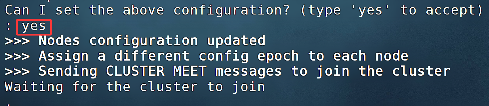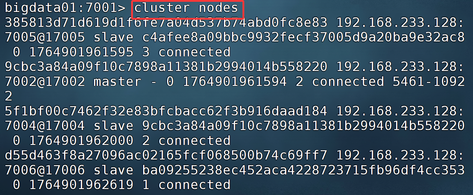redis-cli --cluster create 192.168.233.128:7001 192.168.233.128:7002 192.168.233.128:7003 192.168.233.128:7004 192.168.233.128:7005 192.168.233.128:7006 --cluster-replicas 1