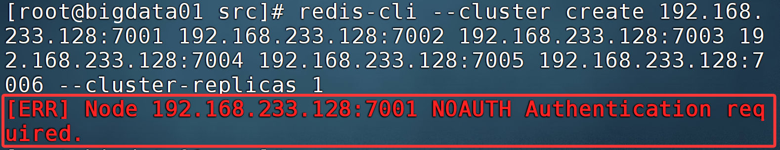 redis-cli --cluster create 192.168.233.128:7001 192.168.233.128:7002 192.168.233.128:7003 192.168.233.128:7004 192.168.233.128:7005 192.168.233.128:7006 --cluster-replicas 1 -a 123456