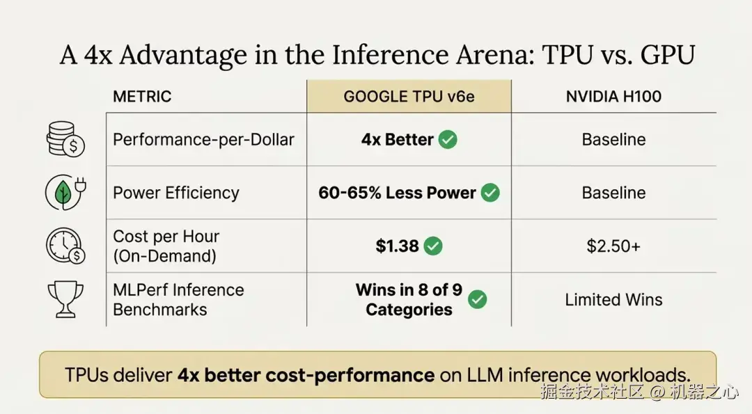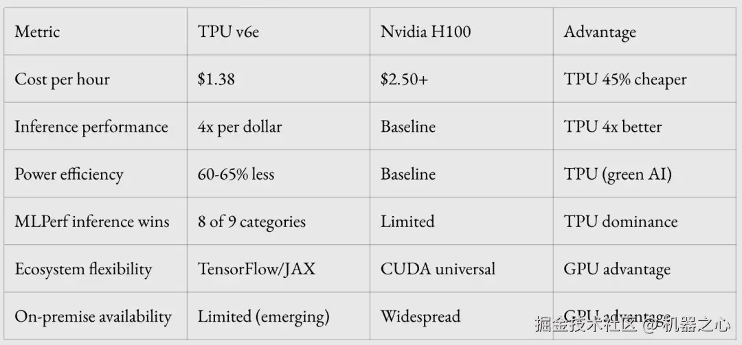总拥有成本 (TCO): 除了硬件成本外,还要考虑冷却、电力基础设施和碳信用额度。如果将这些运营成本考虑在内,TPU 的效率优势将提升至 2-3 倍。