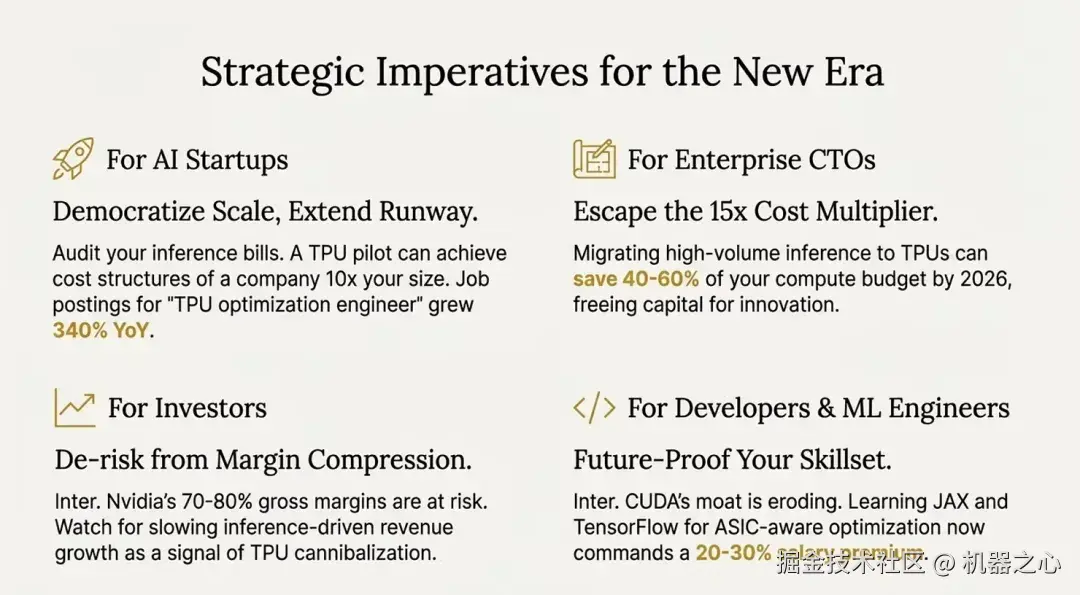 TPU 与 GPU 之争并非抽象概念,它重塑了整个商业模式、投资理念和职业发展轨迹。以下是不同参与者应该如何应对。