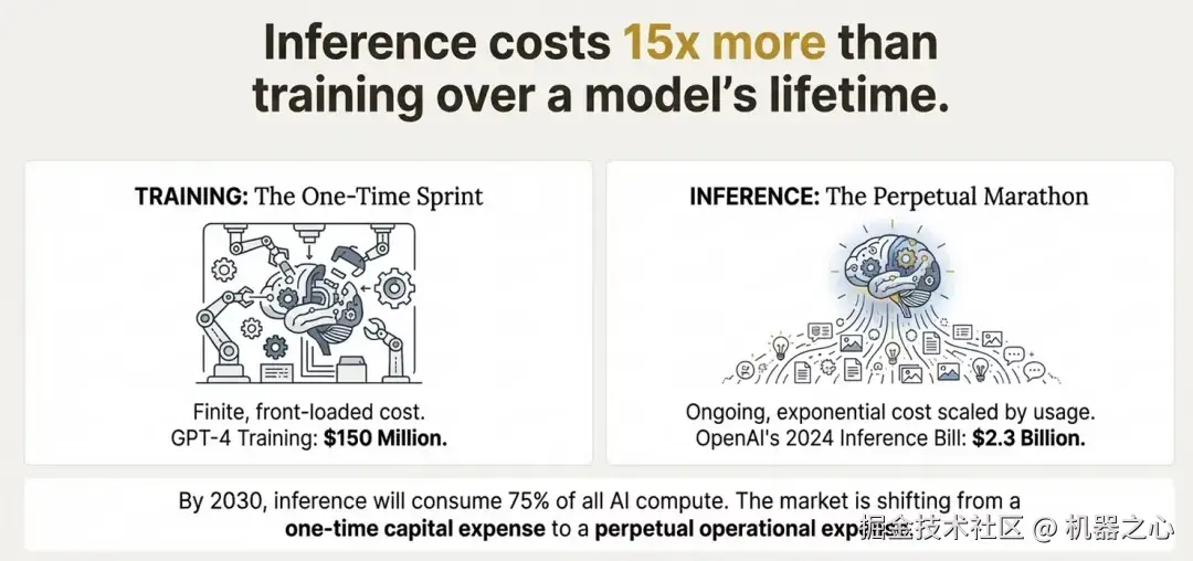 接下来,残酷的数学计算将揭示真相。推理需求并非一次性的,而是随着使用量的增长而呈指数级增长。OpenAI 2024 年的推理支出飙升至 23 亿美元,是 GPT-4 训练成本的 15 倍。在全球范围内,随着 AI 集成到从自动驾驶汽车到个性化广告等各种应用中,机器学习推理成本正在爆炸式增长。分析师估计,到 2026 年,推理需求将比训练需求高出 118 倍。到 2030 年,推理计算可能占人工智能总计算量的 75%,从而推动 7 万亿美元的基础设施投资。