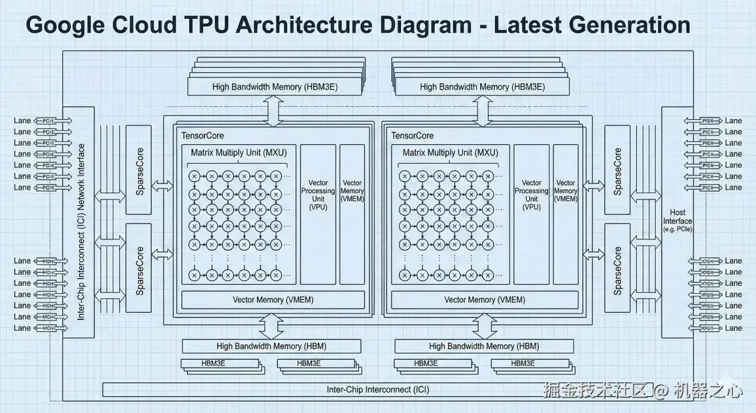 专用集成电路(ASIC)是专业芯片。它们从一开始就为单一用途而设计, 牺牲灵活性以换取极高的效率。谷歌的 TPU 专为矩阵乘法和张量运算而硬编码,这是神经网络的数学基础。每个晶体管、每条电源轨、每条数据通路都针对一个目标进行优化,以闪电般的速度和最小的能量损耗完成张量运算。