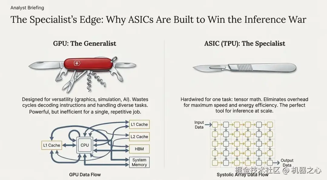 要理解为什么 TPU 正在瓦解英伟达的霸主地位,我们需要掌握 ASIC(专用集成电路)和 GPU(图形处理器)之间根本的架构差异。这不仅仅是技术细节的问题,而是决定数十亿美元计算支出成败的关键所在。
