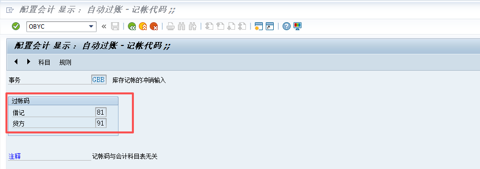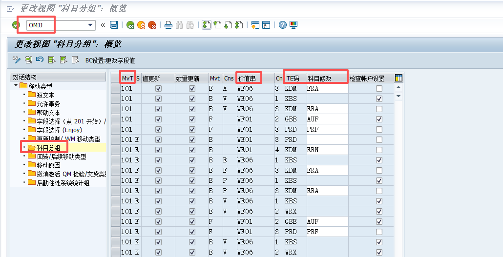 科目修改通过移动类型配置( OMJJ )与事务键绑定(如移动类型201的 GBB 对应 VBR );